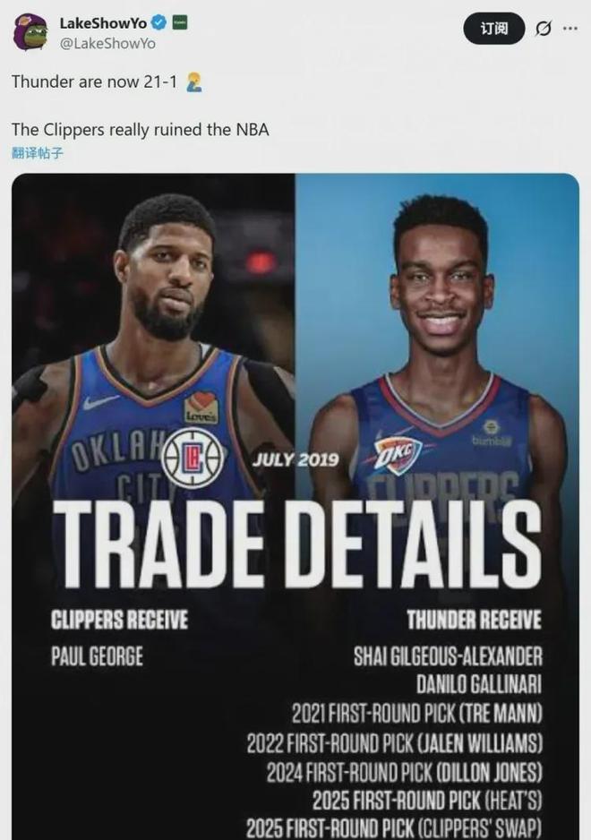 湖人自媒体LakeShowYo:“雷霆现在21胜1负,快船摧毁了联盟。”